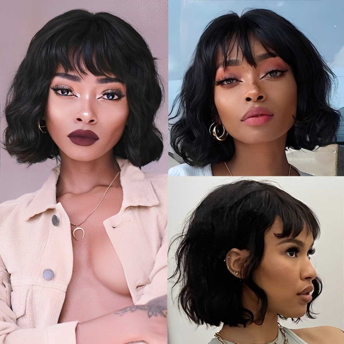 【Wavy bob wig with bangs】: bouncy,pretty and comfortable.Hair length: 08 inch,hair is full and glueless,natural looking.Perfect dress up for dating,parties,daily use. |